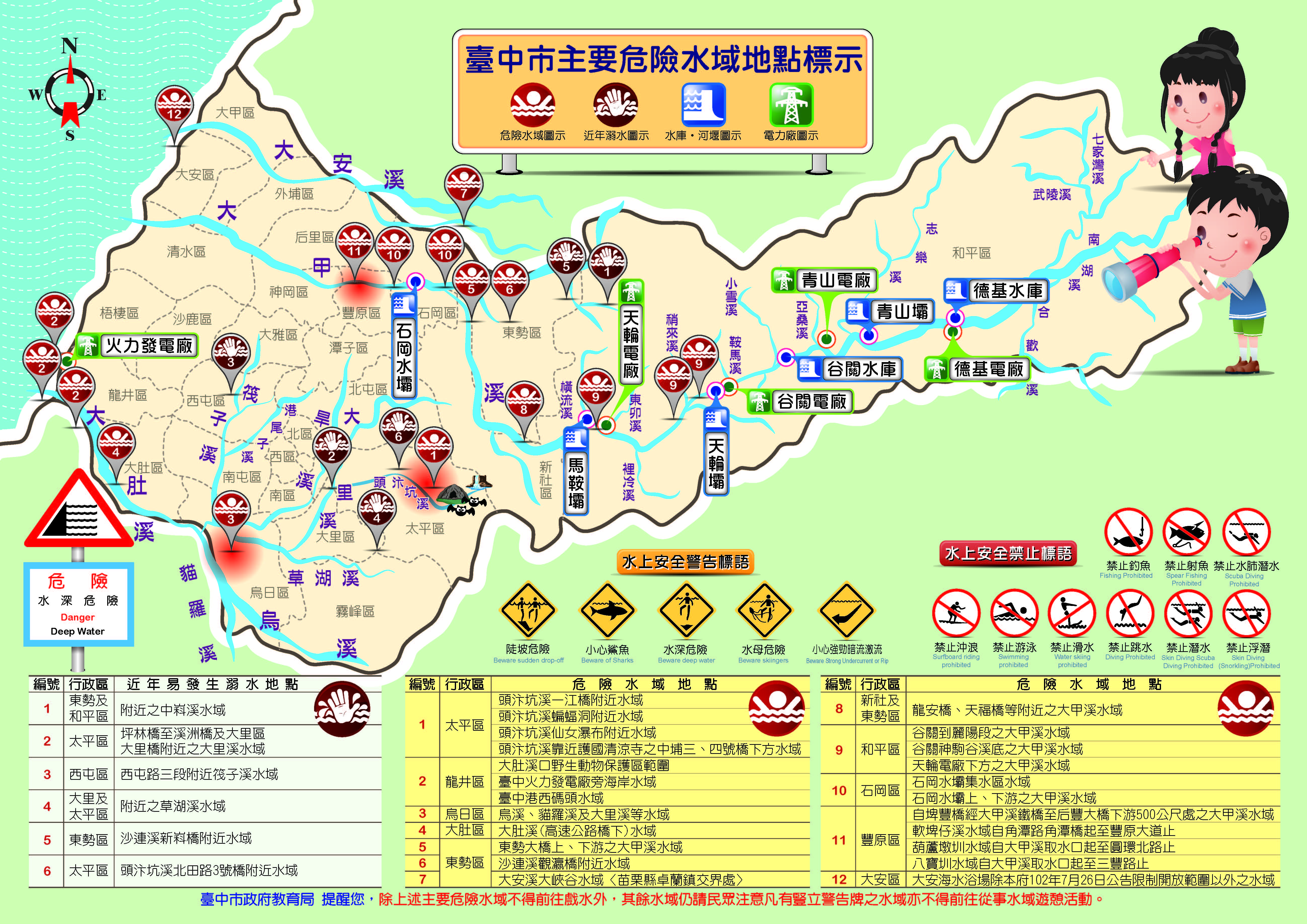 臺中市府公告之危險水域共計 11處,涵蓋溪流、河川及海域,主要風險熱點如下表所示: