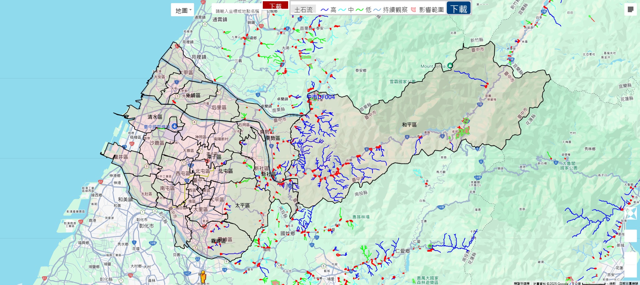 臺中市境內土石流潛勢溪流共計 110條,主要分布於山區及屯區交界處。