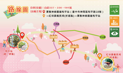 👣健走路線(往返共計約5.6公里):8:00綠園道和平站鳴槍起步👉起步當場統一領取摸彩卷👉紅圳頭義民祠(領取餐點)折返👉綠園道和平站(投入摸彩券)